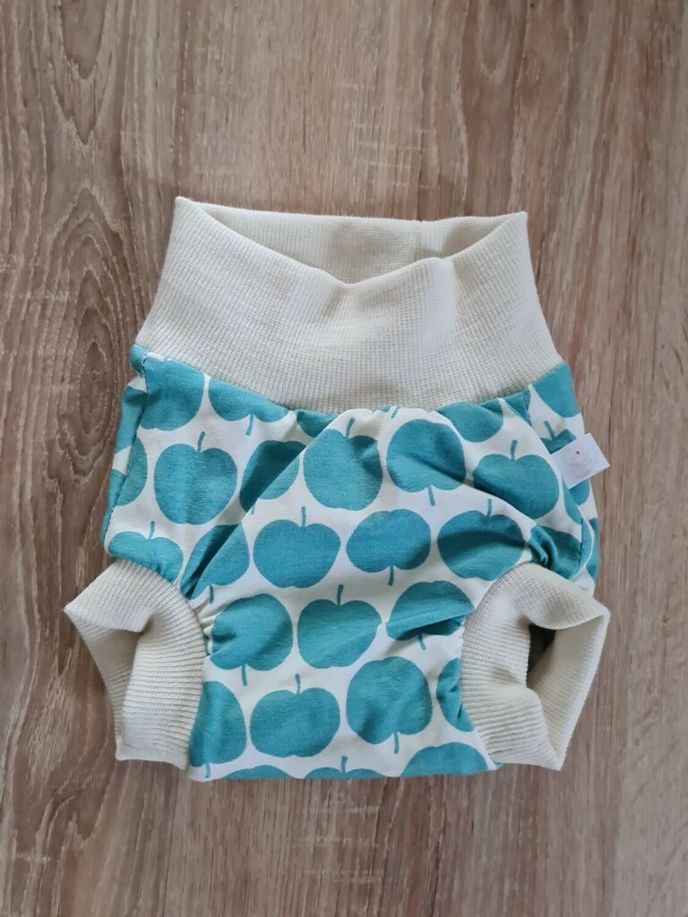 Wenn die Wollwindel mit Jersey „verkleidet“ ist, sieht das wunderschön aus. Es hat jedoch allgemein den Nachteil, dass das Jersey sich schneller Feucht anfühlt als reine Wolle, wenn die Wolle Flüssigkeit aufgesaugt hat.